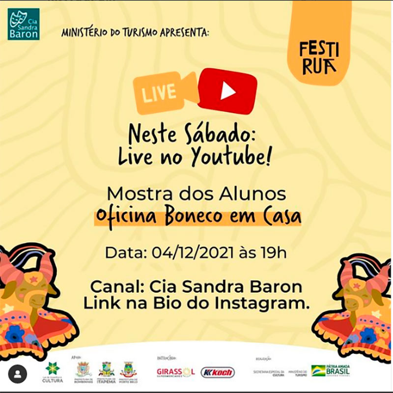 Encerrar as atividades da Oficina Boneco em Casa e apresentar os trabalhos desenvolvidos pelos alunos durante os três meses de aulas. Estes são os objetivos da transmissão ao vivo que vai acontecer no próximo sábado, dia 4 de dezembro, às 19h, no canal youtube.com/c/CiaSandraBaronFestirua. Esta live faz parte ainda da programação do 3° Festival Internacional de Teatro e Títeres e Rua (Festirua), que encantou o público no mês de outubro.