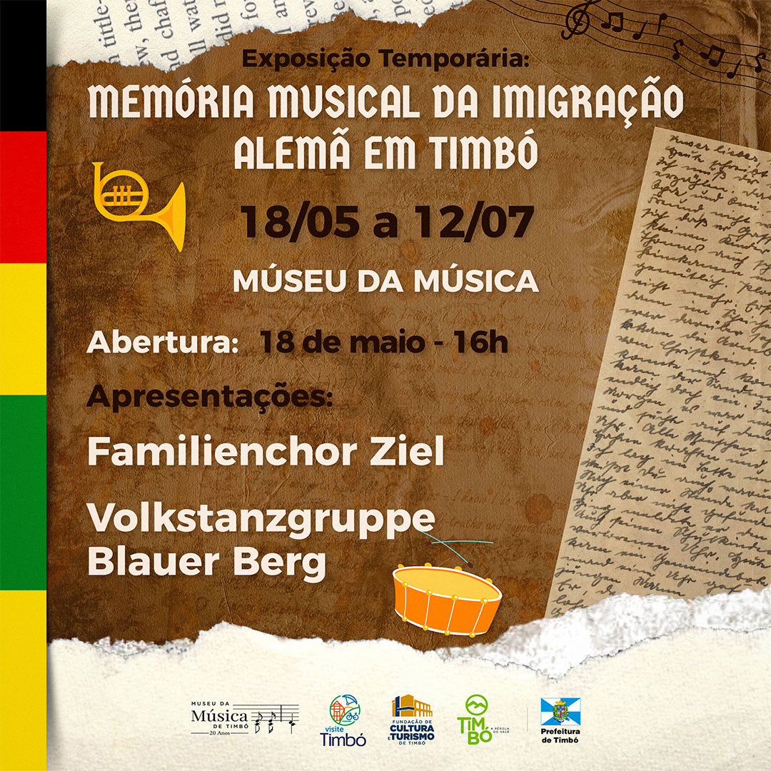 Neste sábado, dia 18 de maio, o Museu da Música de Timbó inicia sua nova exposição temporária, com o tema “Imigração alemã e a memória da música de Timbó”, abordando sobre a imigração dos povos germânicos, que vieram e se estabeleceram no Vale do Itajaí, trazendo a herança da cultura e da música para nossa região.
