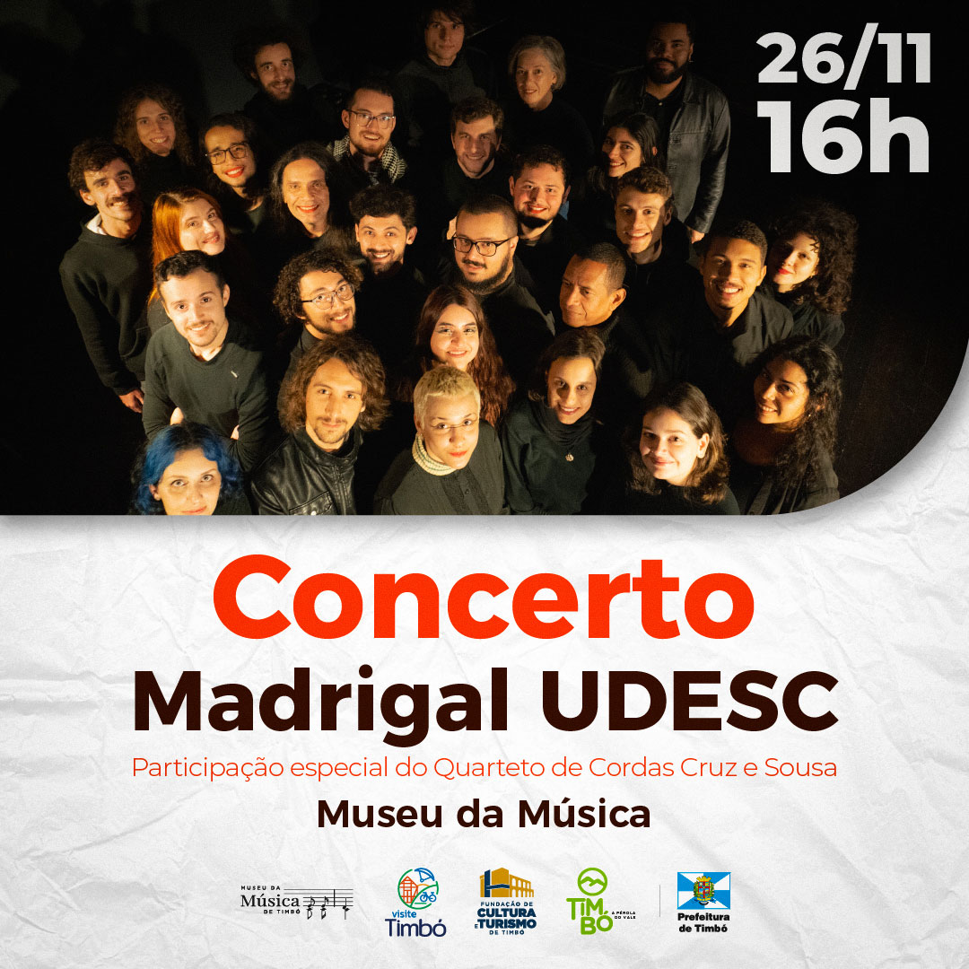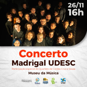 Neste domingo, dia 26 de novembro, o Museu da Música de Timbó recebe o concerto do Madrigal UDESC, com a participação do Quarteto de Cordas Cruz e Sousa.