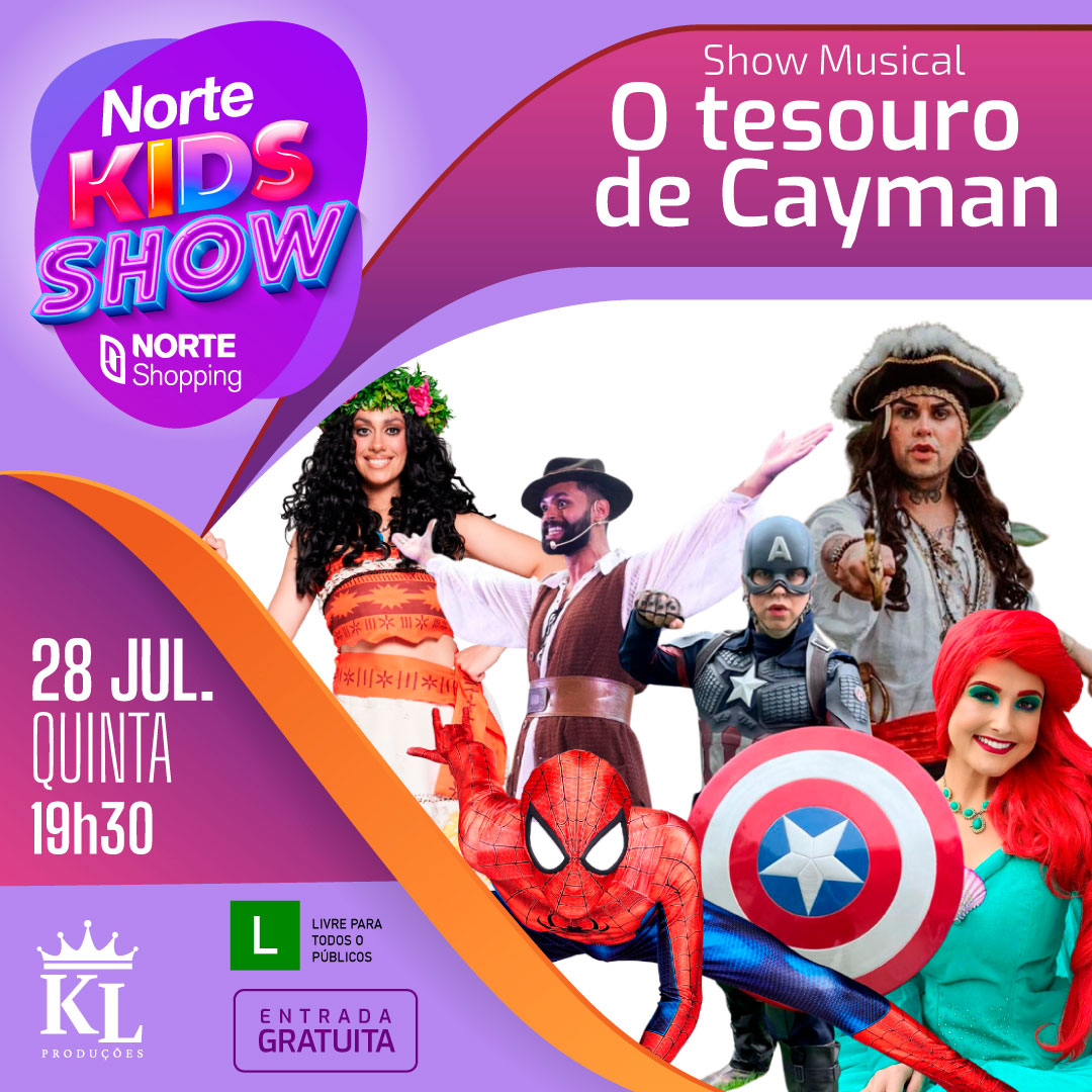 Para a garotada aproveitar os últimos dias de férias, o Norte Shopping traz mais uma atração especial nesta semana. Na quinta-feira (dia 28), às 19h30, será apresentado o musical “O tesouro de Cayman”, na Praça de Alimentação. Com uma história divertida, cheia de magia, personagens fantásticos e muita interação com o público, o espetáculo da KL Produções promete encantar toda a família.
