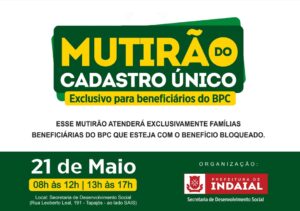 Neste sábado (21), a Secretaria de Desenvolvimento Social de Indaial realizará um mutirão de atendimento para atualização do Cadastro Único com foco no Benefício de Prestação Continuada (BPC), o qual será voltado exclusivamente a beneficiários com o direito bloqueado. A ação acontecerá na sede da Secretaria, situada na rua Leoberto Leal, 191, bairro Tapajós, com atendimento das 8h às 12h e das 13h às 17h.