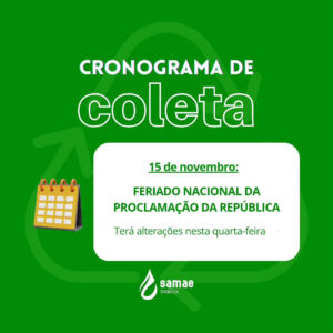 O SAMAE Timbó informa que, devido ao feriado nacional da Proclamação da República, haverá mudanças no cronograma de coleta desta quarta-feira, 15 de novembro.