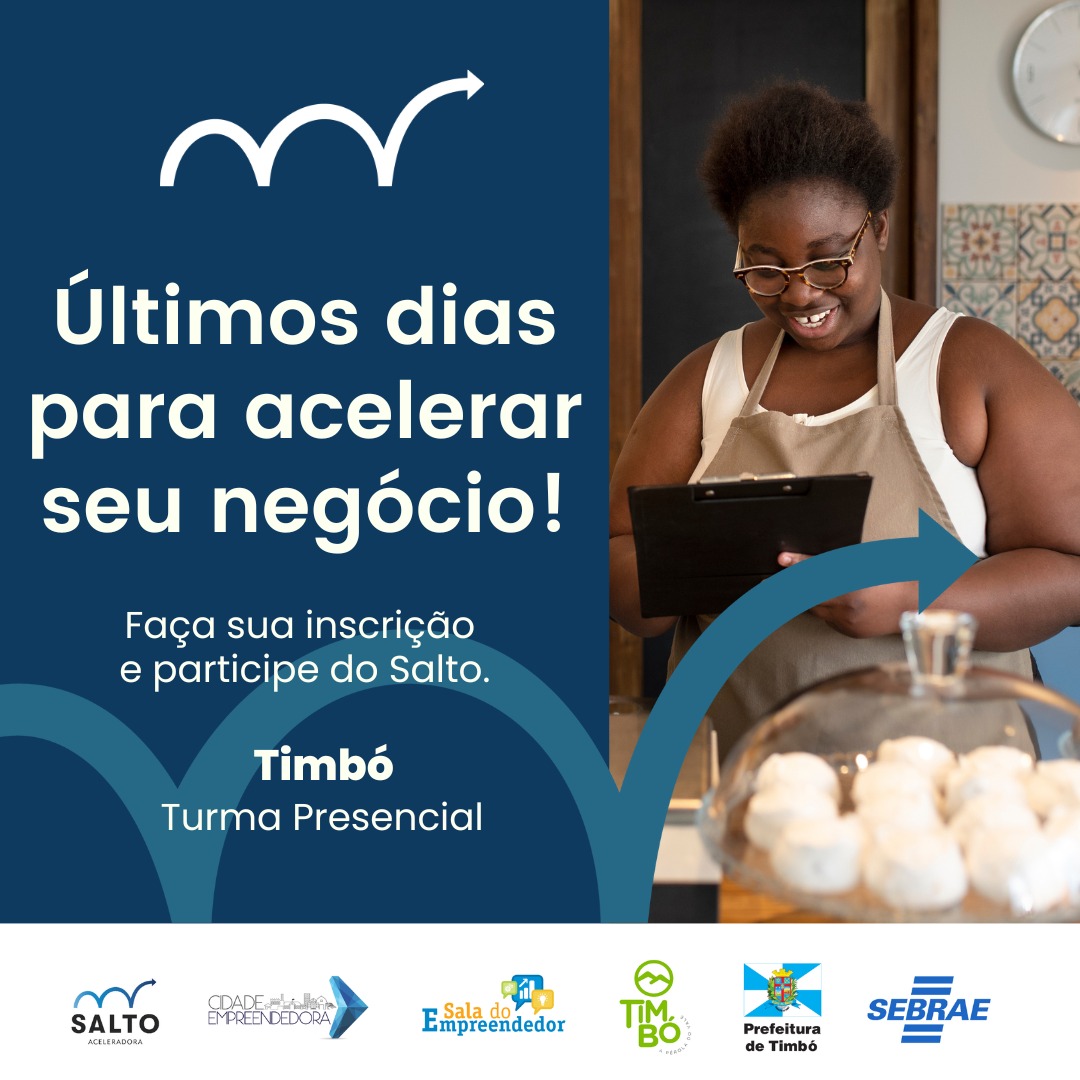 Estão abertas até esta sexta-feira, dia 21 de julho, as inscrições para participar do maior programa de aceleração de Microempreendedores Individuais do Brasil — o Salto Aceleradora. A turma, que será realizada no formato presencial em Timbó, terá vagas limitadas e encontros semanais às segundas-feiras, nos quais os participantes vão aprender muito sobre ser empreendedor, gestão e crescimento de negócios. O programa é gratuito para os MEIs da cidade e a chegada desta turma é uma realização do Sebrae SC, da Prefeitura de Timbó e do Impact Hub Floripa.