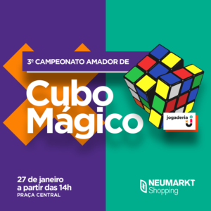 Para quem adora desafios, o 3º Campeonato Amador de Cubo Mágico (3x3x3) é uma das atrações imperdíveis neste sábado, 27, no Neumarkt Shopping em Blumenau. A disputa envolvendo o brinquedo que virou mania nos anos 80 e até hoje faz sucesso. A terceira edição da competição ocorre na Praça Central, a partir das 14h. As inscrições são gratuitas e podem ser feitas no dia do evento das 14h as 15h ou antecipadamente pelo site: https://www.sympla.com.br/campeonato-amador-de-cubo-magico—3-edicao__2291233