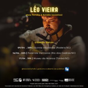 Cantorias, voz, amor e violão. No mês de abril, o cantor e compositor Léo Vieira se apresenta nas cidades de Rodeio, Rio do Cedros e Timbó, em Santa Catarina, pela mini-turnê Partilha & Solidão, shows autorais e intimistas que terão no repertório o álbum Partilha & Solidão, recém-lançado pelo artista. No dia 9, a apresentação será às 20h, na Quinta da Gávea, em Rodeio; no dia 16, o artista se apresenta às 20h, na Fazenda Ventania, em Rio dos Cedros; e no dia 17, Léo Vieira finaliza a mini-turnê com apresentação, às 19h, no Museu da Música, em Timbó. As apresentações serão gratuitas e abertas ao público e, no palco, Léo Vieira estará acompanhado pelo violonista Gian Puppo.