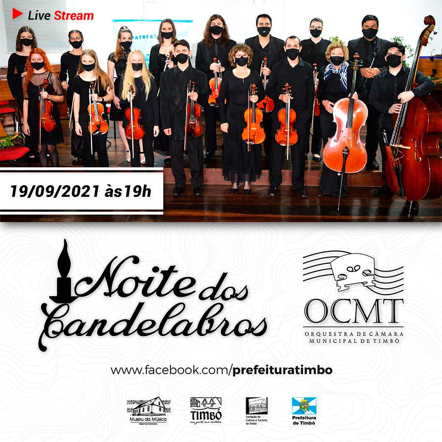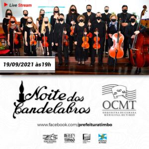 Em setembro o Museu da Música de Timbó completa 17 anos e para celebrar o aniversário, no domingo, dia 19 de setembro, acontece a tradicional Noite dos Candelabros, no Museu da Música. O evento irá contar com a apresentação da Orquestra de Câmara Municipal de Timbó (OCMT), a partir das 19h.
