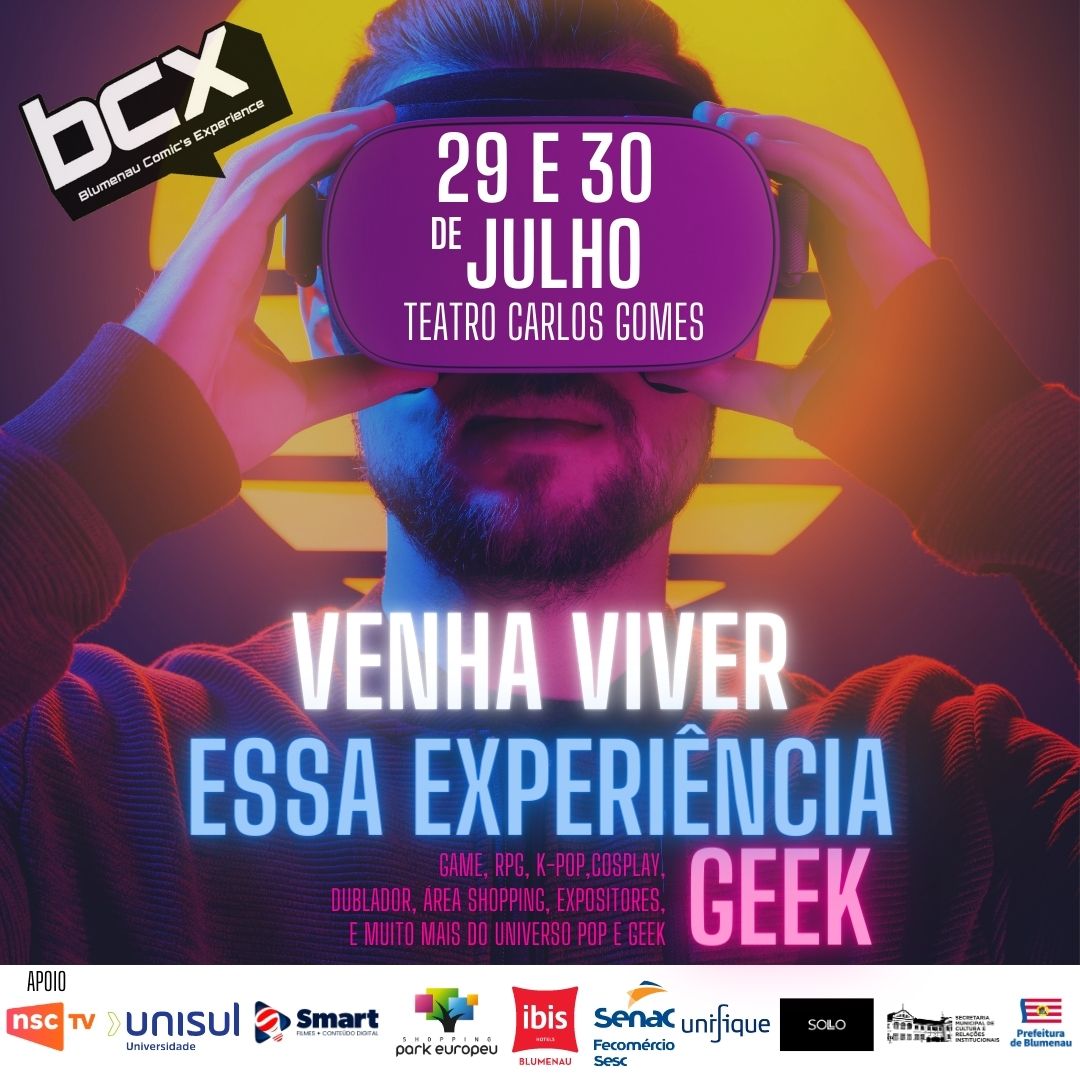 Festival de cultura pop e geek em Blumenau. Nos dias 29 e 30 de julho, a Disse Sim Feira e Eventos realiza o 1º Blumenau Comic’s Experience (BCX), festival de cultura pop e geek, com atrações e assuntos relacionados à arte de quadrinhos, games, mundo geek, kpop e cosplays. O evento traz a Blumenau nomes como Guilherme Briggs (RJ), um dos dubladores mais famosos do Brasil, além de dar voz a personagens como Buzz Lightyear e Scooby Doo, é conhecido por dublar atores como Harrison Ford e Henry Cavill. Além do youtuber Capitão Hunter, caçadores de Pokémon; do quadrinista de Um ângulo de vista Rafa Fritzen; do designer gráfico e cartunista de Um sábado qualquer, Carlos Ruas; e do ilustrador e quadrinista, Paulo Moreira. O festival ocorre no sábado das 14h às 22h, e no domingo das 14h às 20h, e contará com shopping geek, Salão dos Artistas, e áreas vips. Os ingressos são limitados e estão à venda pelo www.eticketcenter.com.br/eventos/bcx