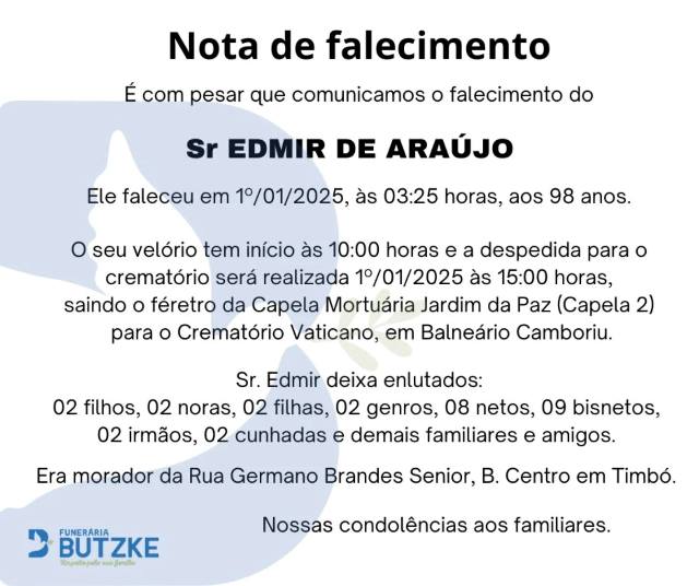 Notas de Falecimento – 01/01/2025 Janeiro 1, 2025 0 Por Redação Whatsapp Share Post Share Pinterest A FAMÍLIA NOSSO SENTIMENTO E CONFORTO——————— OUTRAS NOTAS ACESSE https://bit.ly/2YDELw3 Matérias Relacionadas:No related posts. Valcir Ferrari encerra ciclo de 12 anos à frente da Prefeitura de Rodeio Timbó – Vereadores da 20ª Legislatura tomam posse