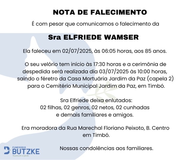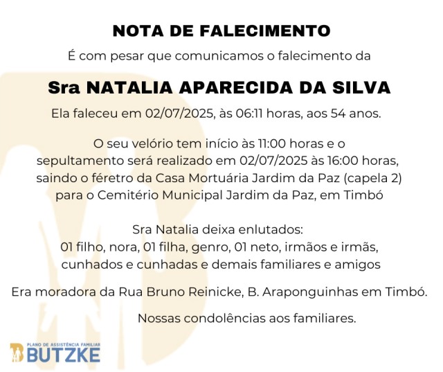 Notas de Falecimento – 02/07/2025 Julho 2, 2025 0 Por Redação Whatsapp Share Post Share Pinterest A FAMÍLIA NOSSO SENTIMENTO E CONFORTO ——————— OUTRAS NOTAS ACESSE https://bit.ly/2YDELw3 Matérias Relacionadas: Notas de Falecimento – 12/06/2025 Notas de Falecimento – 20/06/2025 Notas de Falecimento – 24/06/2025 Notas de Falecimento – 28/06/2025 Notas de Falecimento – 29/06/2025 Câmara de Blumenau – Confira os projetos e proposições aprovados na sessão desta terça-feira (1) CEDUP Timbó: Matrículas abertas para Cursos Técnicos gratuitos no 2º Semestre de 2025