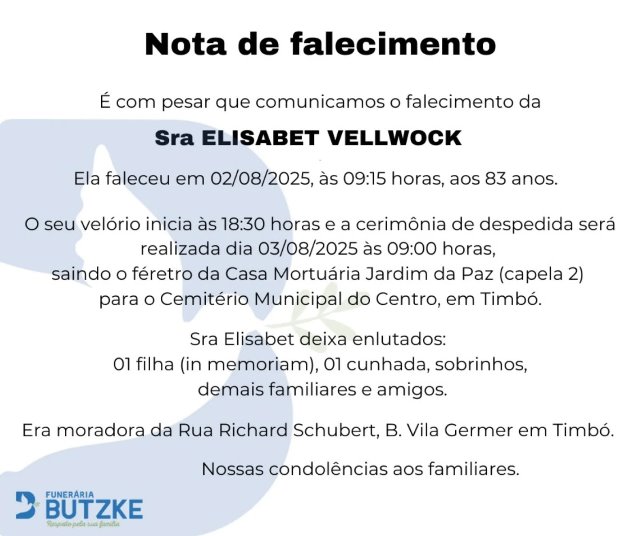 Notas de Falecimento – 02/08/2025 Agosto 2, 2025 0 Por Redação Whatsapp Share Post Share Pinterest A FAMÍLIA NOSSO SENTIMENTO E CONFORTO ——————— OUTRAS NOTAS ACESSE https://bit.ly/2YDELw3 Matérias Relacionadas: Notas de Falecimento – 13/06/2025 Notas de Falecimento – 20/06/2025 Notas de Falecimento – 27/06/2025 Notas de Falecimento – 28/06/2025 Notas de Falecimento – 29/06/2025 Notas de Falecimento – 03/07/2025 Notas de Falecimento – 09/07/2025 Notas de Falecimento – 15/07/2025 ATRA: 40 anos conectando vozes, histórias e corações em Timbó Samae de Timbó – Mais Bairros recebem serviços de limpeza nas redes de distribuição de água