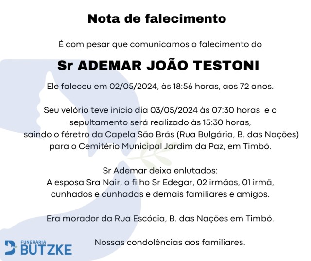 Notas de Falecimento – 03/05/2024 Maio 3, 2024 0 Por Redação Whatsapp Share Post Share Pinterest A FAMÍLIA NOSSO SENTIMENTO E CONFORTO——————— OUTRAS NOTAS ACESSE https://bit.ly/2YDELw3 Matérias Relacionadas:No related posts. PMSC comemora 189 anos, recebe novos equipamentos, realiza promoções de oficiais e praças e entrega condecorações Coluna Escoteira – por Rogerio Gessner 03/05/2024