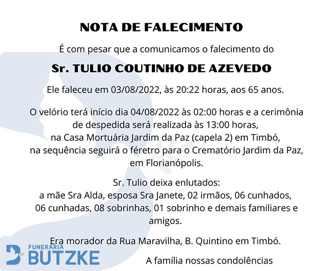 O velório terá início às 18:30 horas e sepultamento acontecerá em 04/08/2022 com início da cerimônia às 14:30 horas, saindo o féretro da sua residência Tifa Heinig, s/n, B. Mulde Central para o Cemitério Municipal da Mulde Baixa, em Indaial.