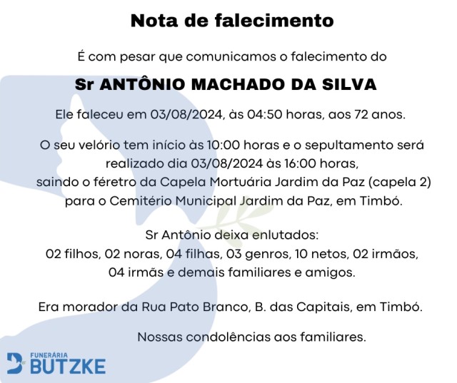 Notas de Falecimento – 03/08/2024 Agosto 3, 2024 0 Por Redação Whatsapp Share Post Share Pinterest A FAMÍLIA NOSSO SENTIMENTO E CONFORTO——————— OUTRAS NOTAS ACESSE https://bit.ly/2YDELw3 Matérias Relacionadas:No related posts. Sebrae/SC lança guia para candidatos com foco em pequenos negócios Notas de Falecimento – 04/08/2024