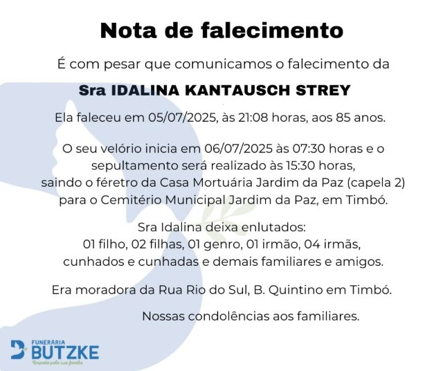 Notas de Falecimento – 06/07/2025 Julho 6, 2025 0 Por Redação Whatsapp Share Post Share Pinterest A FAMÍLIA NOSSO SENTIMENTO E CONFORTO ——————— OUTRAS NOTAS ACESSE https://bit.ly/2YDELw3 Matérias Relacionadas: Notas de Falecimento – 12/06/2025 Notas de Falecimento – 20/06/2025 Notas de Falecimento – 21/06/2025 Notas de Falecimento – 24/06/2025 Notas de Falecimento – 28/06/2025 Notas de Falecimento – 29/06/2025 Novo Mirante do Comércio é inaugurado em Timbó e homenageia a força do comércio local Primeira Brasileira eleita Vereadora na Itália encerra mandato histórico e reforça vínculos com o Brasil