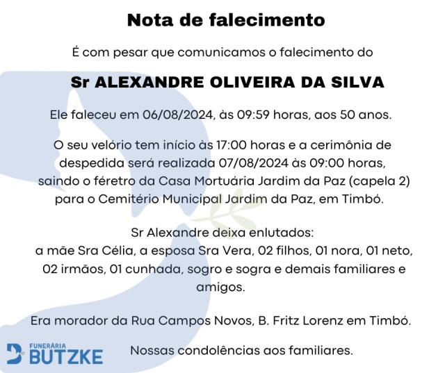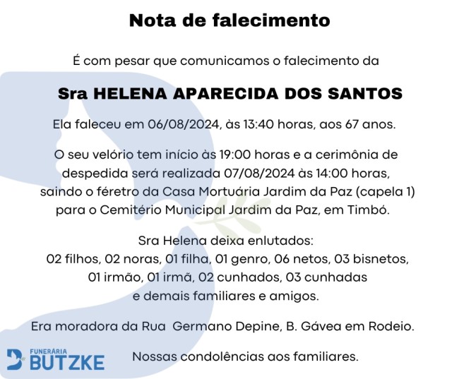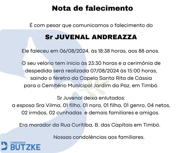 Notas de Falecimento – 06/08/2024 Agosto 6, 2024 0 Por Redação Whatsapp Share Post Share Pinterest A FAMÍLIA NOSSO SENTIMENTO E CONFORTO——————— OUTRAS NOTAS ACESSE https://bit.ly/2YDELw3 Matérias Relacionadas:No related posts. Notas de Falecimento – 05/08/2024 Artesanato do Vale Europeu representa SC no Salão do Turismo no RJ