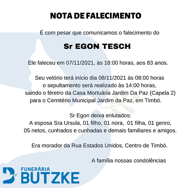 Notas de Falecimento – 07/11/2021 Novembro 7, 2021 0 Por Redação Whatsapp Share Post Share Pinterest Matérias Relacionadas:No related posts. Coronavírus: Matriz de Risco aponta 12 regiões no nível moderado em SC – 06/11/2021 Comissão Especial trabalha na revisão do Regimento Interno da Câmara de Timbó
