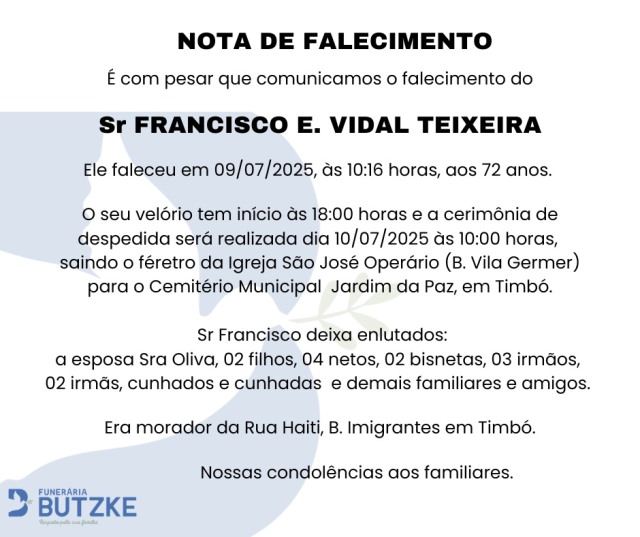 Notas de Falecimento – 09/07/2025 Julho 9, 2025 0 Por Redação Whatsapp Share Post Share Pinterest A FAMÍLIA NOSSO SENTIMENTO E CONFORTO ——————— OUTRAS NOTAS ACESSE https://bit.ly/2YDELw3 Matérias Relacionadas: Notas de Falecimento – 12/06/2025 Notas de Falecimento – 13/06/2025 Notas de Falecimento – 20/06/2025 Notas de Falecimento – 24/06/2025 Notas de Falecimento – 27/06/2025 Notas de Falecimento – 28/06/2025 Notas de Falecimento – 29/06/2025 Deputado Gilson Marques destina mais de R$ 620 mil para a saúde de Rodeio Câmara de Blumenau realiza 5ª sessão itinerante de 2025 no bairro Bom Retiro