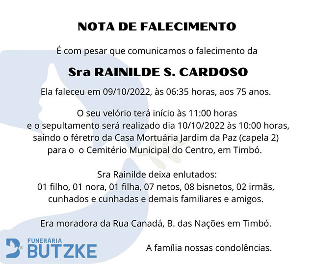 Notas de Falecimento – 09/10/2022 Outubro 9, 2022 0 Por Redação Whatsapp Share Post Share Pinterest A FAMÍLIA NOSSO SENTIMENTO E CONFORTO——————— OUTRAS NOTAS ACESSE https://bit.ly/2YDELw3 Matérias Relacionadas:No related posts. Notas de Falecimento – 08/10/2022 Futebol Americano – T-Rex é campeão da Conferência Sul da Liga BFA 2022