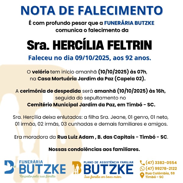 Notas de Falecimento – 09/10/2025 Outubro 9, 2025 0 Por Redação Whatsapp Share Post Share Pinterest A FAMÍLIA NOSSO SENTIMENTO E CONFORTO ——————— OUTRAS NOTAS ACESSE https://mla.bs/4a87181d Matérias Relacionadas: Notas de Falecimento – 13/06/2025 Notas de Falecimento – 20/06/2025 Notas de Falecimento – 27/06/2025 Notas de Falecimento – 28/06/2025 Notas de Falecimento – 29/06/2025 Notas de Falecimento – 09/07/2025 Notas de Falecimento – 15/07/2025 Notas de Falecimento – 02/08/2025 Notas de Falecimento – 14/08/2025 Notas de Falecimento – 25/08/2025 Notas de Falecimento – 24/09/2025 Notas de Falecimento – 02/10/2025 Comissão da Câmara de Blumenau traz histórico e faz primeiros encaminhamentos sobre a Barragem de José Boiteux A Leitura como Ferramenta de Proteção e Evolução para Jovens Autistas