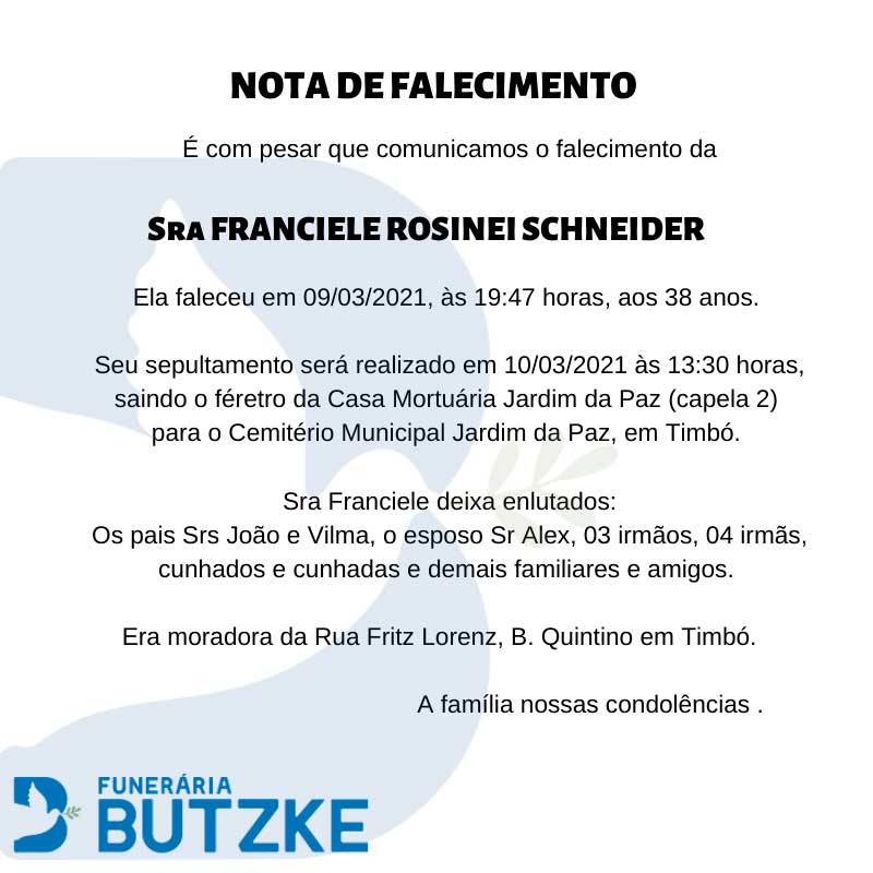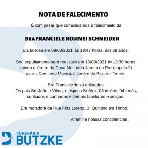 Seu velório terá início às 09:00 horas do dia 11/03/2021 e o sepultamento será realizado às 15:00 horas, saindo o féretro da Casa Mortuária Jardim da Paz (capela 1) para o Cemitério Municipal Jardim da Paz, em Timbó.