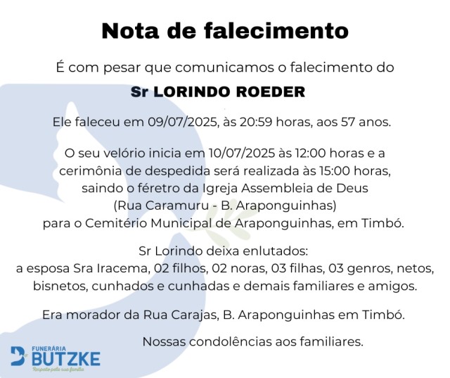 Notas de Falecimento – 10/07/2025 Julho 10, 2025 0 Por Redação Whatsapp Share Post Share Pinterest A FAMÍLIA NOSSO SENTIMENTO E CONFORTO ——————— OUTRAS NOTAS ACESSE https://bit.ly/2YDELw3 Matérias Relacionadas: Notas de Falecimento – 09/06/2025 Notas de Falecimento – 13/06/2025 Notas de Falecimento – 27/06/2025 Notas de Falecimento – 28/06/2025 Notas de Falecimento – 29/06/2025 Notas de Falecimento – 03/07/2025 Notas de Falecimento – 09/07/2025 Estudantes de Timbó viajam para receber premiação da Olimpíada Brasileira de Matemática Câmara de Timbó vai discutir o Plano Plurianual do município em Audiência Pública