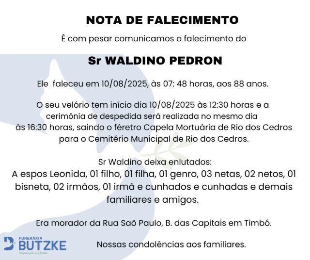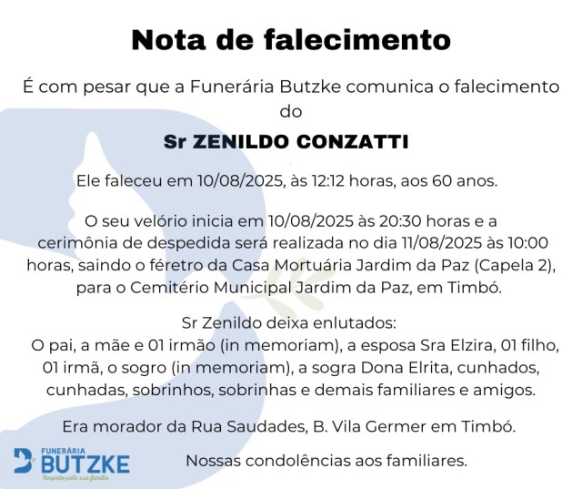 Notas de Falecimento – 10/08/2025 Agosto 10, 2025 0 Por Redação Whatsapp Share Post Share Pinterest A FAMÍLIA NOSSO SENTIMENTO E CONFORTO ——————— OUTRAS NOTAS ACESSE https://bit.ly/2YDELw3 Matérias Relacionadas: Notas de Falecimento – 21/06/2025 Notas de Falecimento – 06/07/2025 Notas de Falecimento – 11/07/2025 Notas de Falecimento – 27/07/2025 Notas de Falecimento – 08/08/2025 Sebrae Delas lança novas trilhas gratuitas para empreendedoras Samae realiza melhoria na rede no Bairro Vila Germer