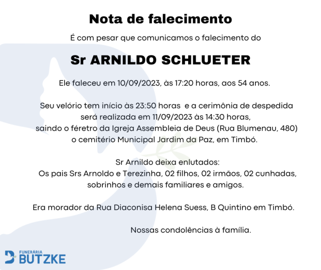 Notas de Falecimento – 10/09/2023 Setembro 10, 2023 0 Por Redação Whatsapp Share Post Share Pinterest A FAMÍLIA NOSSO SENTIMENTO E CONFORTO——————— OUTRAS NOTAS ACESSE https://bit.ly/2YDELw3 Matérias Relacionadas:No related posts. Segunda oitiva sobre Lei Paulo Gustavo é realizada em Timbó Apresentação de ferramentas de suporte a novos empreendedores no Vale do Itajaí acontece na terça-feira (12)