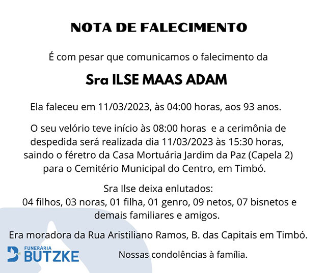 Notas de Falecimento – 11/03/2023 Março 11, 2023 0 Por Redação Whatsapp Share Post Share Pinterest A FAMÍLIA NOSSO SENTIMENTO E CONFORTO——————— OUTRAS NOTAS ACESSE https://bit.ly/2YDELw3 Matérias Relacionadas:No related posts. Secretaria de Saúde de Timbó adquire nova ambulância Notas de Falecimento – 12/03/2023