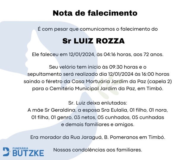 Notas de Falecimento – 12/01/2024 Janeiro 12, 2024 0 Por Redação Whatsapp Share Post Share Pinterest A FAMÍLIA NOSSO SENTIMENTO E CONFORTO——————— OUTRAS NOTAS ACESSE https://bit.ly/2YDELw3 Matérias Relacionadas:No related posts. Novos Conselheiros Tutelares de Rodeio são empossados SCGÁS: esclarecimento e alerta contra fraudes