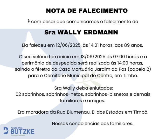 Notas de Falecimento – 12/06/2025 Junho 12, 2025 0 Por Redação Whatsapp Share Post Share Pinterest A FAMÍLIA NOSSO SENTIMENTO E CONFORTO ——————— OUTRAS NOTAS ACESSE https://bit.ly/2YDELw3 Matérias Relacionadas: Notas de Falecimento – 09/06/2025 Câmara de Blumenau instaura CPI para investigar contrato de concessão do serviço de esgotamento sanitário Hans Hermann Ziel é homenageado com título de cidadão honorário timboense