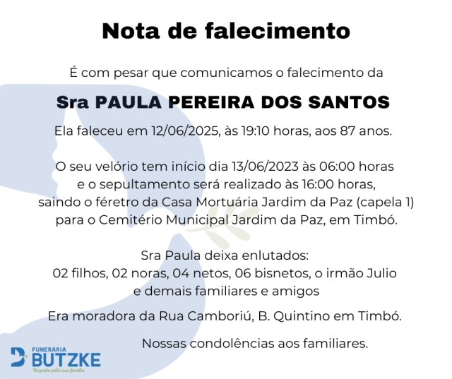 Notas de Falecimento – 13/06/2025 Junho 13, 2025 0 Por Redação Whatsapp Share Post Share Pinterest A FAMÍLIA NOSSO SENTIMENTO E CONFORTO ——————— OUTRAS NOTAS ACESSE https://bit.ly/2YDELw3 Matérias Relacionadas: Notas de Falecimento – 07/06/2025 Notas de Falecimento – 09/06/2025 Coluna Escoteira – por Rogerio Gessner 13/06/2025 Vereadores do NOVO de Indaial realizam entrega de ofícios das emendas parlamentares do Deputado Gilson Marques no valor de R$ 500 mil