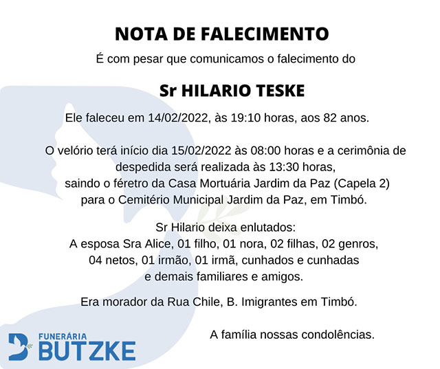 O velório terá início dia 14/02/2022 às 09:00 horas e a cerimônia de despedida será realizada às 14:30 horas, saindo o féretro da Casa Mortuária Jardim da Paz (Capela 2) para o Cemitério Municipal Jardim da Paz, em Timbó.
