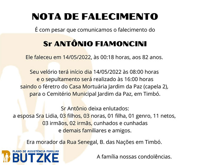Notas de Falecimento – 14/05/2022 Maio 14, 2022 0 Por Redação Whatsapp Share Post Share Pinterest A FAMÍLIA NOSSO SENTIMENTO E CONFORTO ——————— OUTRAS NOTAS ACESSE https://bit.ly/2YDELw3 Matérias Relacionadas:No related posts. SAMAE Timbó participa do 50º Congresso Nacional de Saneamento Básico da ASSEMAE Santa Catarina terá ventos fortes, geada e possibilidade de neve nos próximos dias