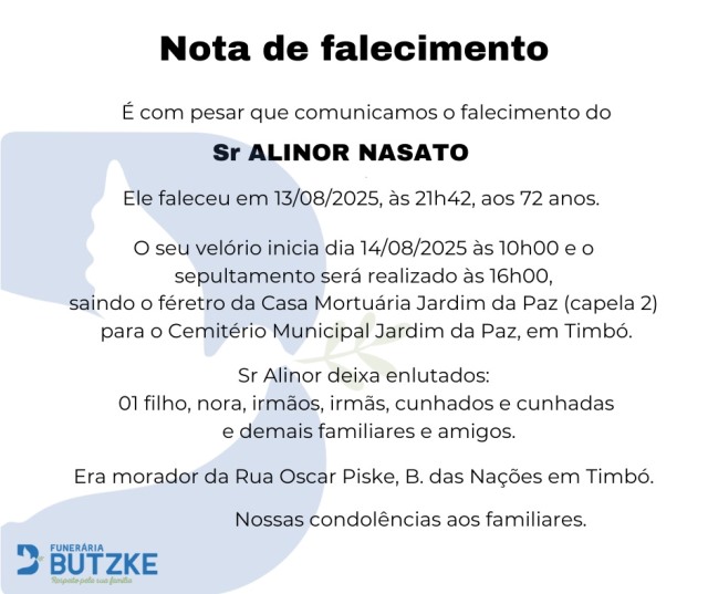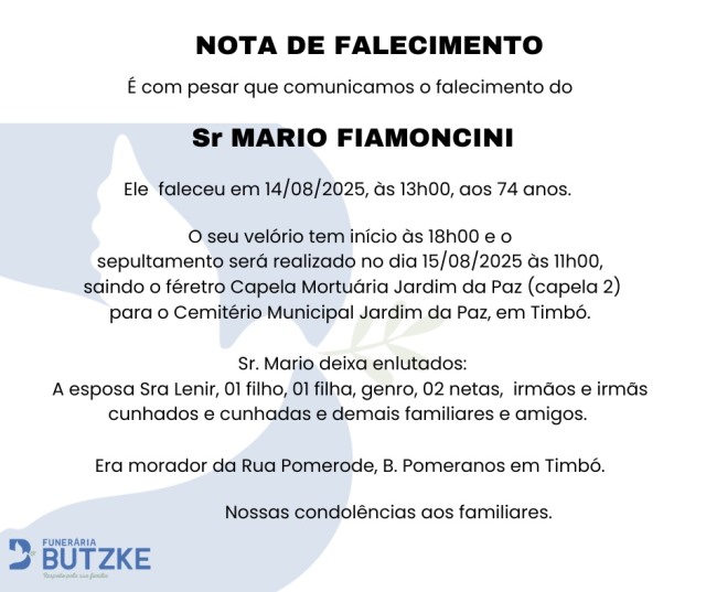 Notas de Falecimento – 14/08/2025 Agosto 14, 2025 0 Por Redação Whatsapp Share Post Share Pinterest A FAMÍLIA NOSSO SENTIMENTO E CONFORTO ——————— OUTRAS NOTAS ACESSE https://bit.ly/2YDELw3 Matérias Relacionadas: Notas de Falecimento – 07/06/2025 Notas de Falecimento – 09/06/2025 Notas de Falecimento – 30/06/2025 Notas de Falecimento – 08/07/2025 Notas de Falecimento – 16/07/2025 Notas de Falecimento – 23/07/2025 Notas de Falecimento – 25/07/2025 Notas de Falecimento – 29/07/2025 Notas de Falecimento – 07/08/2025 Audiência pública na Câmara de Blumenau expõe desafios da mobilidade para pessoas com deficiência Localidade de Santa Maria em Benedito Novo terá retomada das obras de pavimentação
