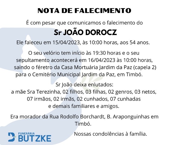 Notas de Falecimento – 15/04/2023 Abril 15, 2023 0 Por Redação Whatsapp Share Post Share Pinterest A FAMÍLIA NOSSO SENTIMENTO E CONFORTO——————— OUTRAS NOTAS ACESSE https://bit.ly/2YDELw3 Matérias Relacionadas:No related posts. Era uma vez… Timbó antigamente – 15/04/2023 Temporais com raios, rajadas de vento, eventual queda de granizo, chuva intensa e volumosa entre domingo (16) e segunda-feira (17)