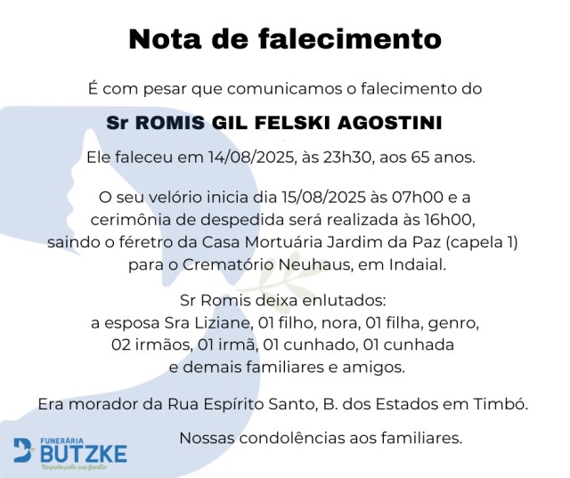 Notas de Falecimento – 15/08/2025 Agosto 15, 2025 0 Por Redação Whatsapp Share Post Share Pinterest A FAMÍLIA NOSSO SENTIMENTO E CONFORTO ——————— OUTRAS NOTAS ACESSE https://bit.ly/2YDELw3 Matérias Relacionadas: Notas de Falecimento – 12/06/2025 Notas de Falecimento – 20/06/2025 Notas de Falecimento – 21/06/2025 Notas de Falecimento – 24/06/2025 Notas de Falecimento – 28/06/2025 Notas de Falecimento – 10/07/2025 Notas de Falecimento – 27/07/2025 Notas de Falecimento – 01/08/2025 Notas de Falecimento – 10/08/2025 SOMAR Vale Europeu participa da 12ª Reunião da Governança Geral do PEDEM e ELI Coluna Escoteira – por Rogerio Gessner 15/08/2025