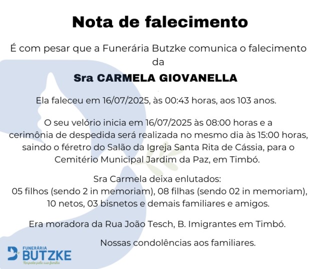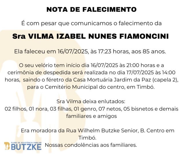 Notas de Falecimento – 16/07/2025 Julho 16, 2025 0 Por Redação Whatsapp Share Post Share Pinterest A FAMÍLIA NOSSO SENTIMENTO E CONFORTO ——————— OUTRAS NOTAS ACESSE https://bit.ly/2YDELw3 Matérias Relacionadas: Notas de Falecimento – 07/06/2025 Notas de Falecimento – 02/07/2025 Notas de Falecimento – 06/07/2025 Notas de Falecimento – 08/07/2025 Notas de Falecimento – 11/07/2025 Diversidade na sala de aula: melhorias e desafios Câmaras de comércio nos EUA e no Brasil pedem suspensão de taxas