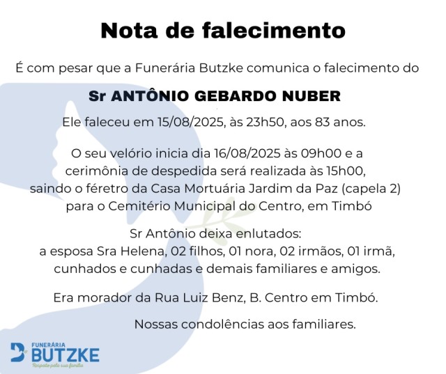 Notas de Falecimento – 16/08/2025 Agosto 16, 2025 0 Por Redação Whatsapp Share Post Share Pinterest A FAMÍLIA NOSSO SENTIMENTO E CONFORTO ——————— OUTRAS NOTAS ACESSE https://bit.ly/2YDELw3 Matérias Relacionadas: Notas de Falecimento – 12/06/2025 Notas de Falecimento – 20/06/2025 Notas de Falecimento – 21/06/2025 Notas de Falecimento – 24/06/2025 Notas de Falecimento – 10/07/2025 Notas de Falecimento – 27/07/2025 Notas de Falecimento – 01/08/2025 Notas de Falecimento – 10/08/2025 Notas de Falecimento – 15/08/2025 Coluna Escoteira – por Rogerio Gessner 15/08/2025 Timbó Futsal volta a vencer no Campeonato Catarinense Sub-16!