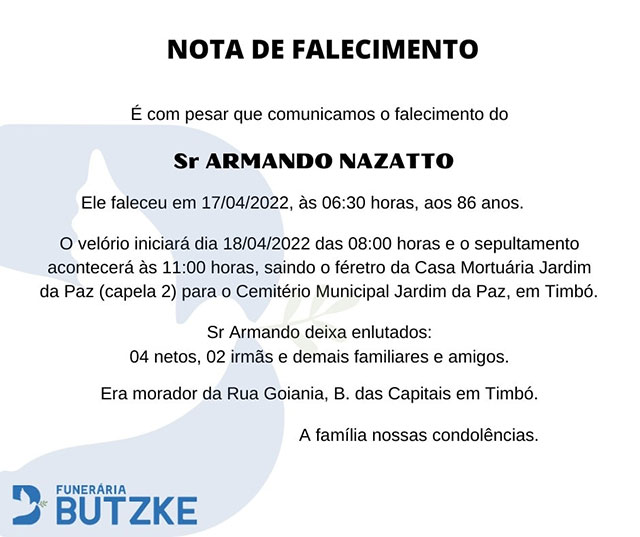 O velório terá início dia 18/04/2022 às 11:00 horas e o sepultamento acontecerá às 15:00 horas, saindo o féretro da Casa Mortuária Jardim da Paz (capela 1), para o Cemitério Municipal Jardim da Paz, em Timbó.