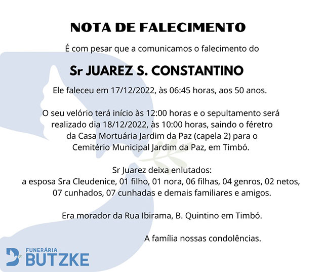 Notas de Falecimento – 17/12/2022 Dezembro 17, 2022 0 Por Redação Whatsapp Share Post Share Pinterest A FAMÍLIA NOSSO SENTIMENTO E CONFORTO——————— OUTRAS NOTAS ACESSE https://bit.ly/2YDELw3 Matérias Relacionadas:No related posts. Timbó recebe Amado Batista na próxima quarta-feira Vereadores aprovam denominação do CIC como Centro Integrado de Cultura Ingo Germer, dentre outros projetos