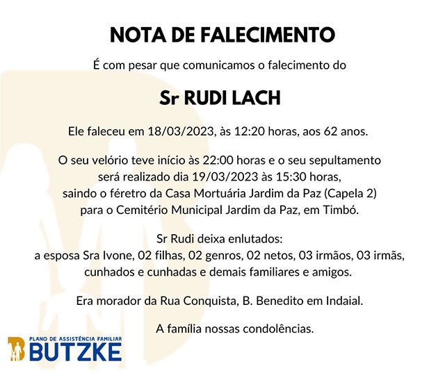Notas de Falecimento – 18/03/2023 Março 18, 2023 0 Por Redação Whatsapp Share Post Share Pinterest A FAMÍLIA NOSSO SENTIMENTO E CONFORTO——————— OUTRAS NOTAS ACESSE https://bit.ly/2YDELw3 Matérias Relacionadas:No related posts. Timbó realiza evento comemorativo aos 89 anos de emancipação política Feira do Empreendedor acontece neste sábado em Timbó