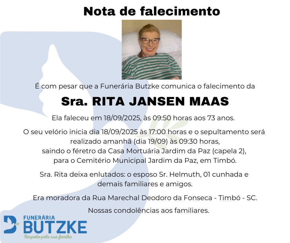 Notas de Falecimento – 18/09/2025 Setembro 18, 2025 0 Por Redação Whatsapp Share Post Share Pinterest A FAMÍLIA NOSSO SENTIMENTO E CONFORTO ——————— OUTRAS NOTAS ACESSE https://mla.bs/4a87181d Matérias Relacionadas: Notas de Falecimento – 09/06/2025 Notas de Falecimento – 13/06/2025 Notas de Falecimento – 30/06/2025 Notas de Falecimento – 03/07/2025 Notas de Falecimento – 08/07/2025 Notas de Falecimento – 16/07/2025 Notas de Falecimento – 25/07/2025 Notas de Falecimento – 29/07/2025 Notas de Falecimento – 18/08/2025 Notas de Falecimento – 23/08/2025 Notas de Falecimento – 26/08/2025 Notas de Falecimento – 09/09/2025 Blumenau: Cinsete Produtora estreia videoarte O Tempo: Ecos e Rupturas dia 22 de setembro Molhos que transformam o frango: da praticidade à alta gastronomia