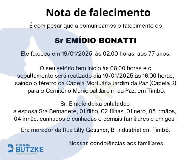 Notas de Falecimento – 19/01/2025 Janeiro 19, 2025 0 Por Redação Whatsapp Share Post Share Pinterest A FAMÍLIA NOSSO SENTIMENTO E CONFORTO——————— OUTRAS NOTAS ACESSE https://bit.ly/2YDELw3 Matérias Relacionadas:No related posts. Público da Festa Pomerana cresce 30% e organização muda dinâmica do novo pavilhão Apresentador Léo Batista morre no Rio de Janeiro, aos 92 anos