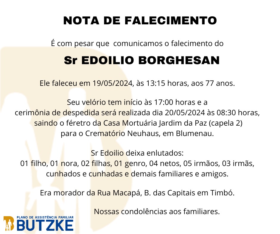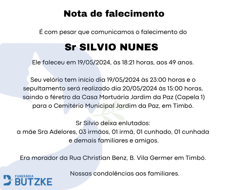 Notas de Falecimento – 19/05/2024 Maio 19, 2024 0 Por Redação Whatsapp Share Post Share Pinterest A FAMÍLIA NOSSO SENTIMENTO E CONFORTO——————— OUTRAS NOTAS ACESSE https://bit.ly/2YDELw3 Matérias Relacionadas:No related posts. Vacinas continuam salvando milhões de Vidas Centro de Atendimento à Dengue de Timbó passará a atender na antiga Sociedade Cultural
