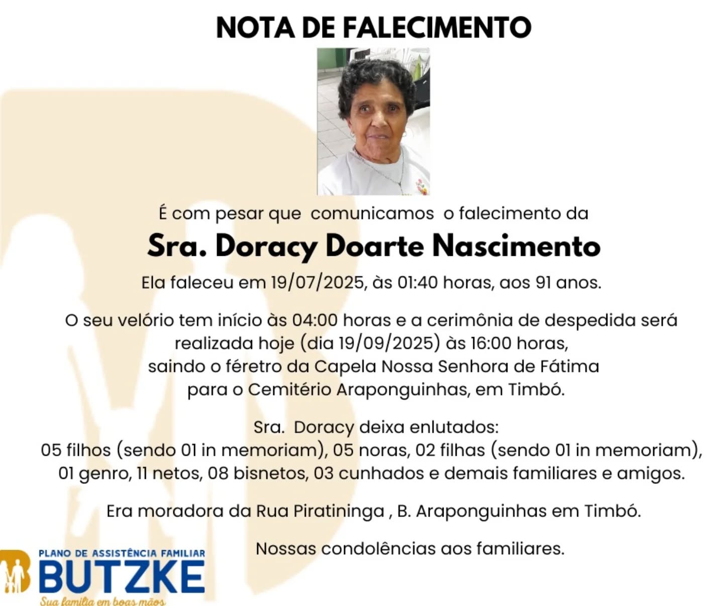 Notas de Falecimento – 19/09/2025 Setembro 19, 2025 0 Por Redação Whatsapp Share Post Share Pinterest A FAMÍLIA NOSSO SENTIMENTO E CONFORTO ——————— OUTRAS NOTAS ACESSE https://mla.bs/4a87181d Matérias Relacionadas: Notas de Falecimento – 09/06/2025 Notas de Falecimento – 13/06/2025 Notas de Falecimento – 30/06/2025 Notas de Falecimento – 03/07/2025 Notas de Falecimento – 08/07/2025 Notas de Falecimento – 16/07/2025 Notas de Falecimento – 25/07/2025 Notas de Falecimento – 29/07/2025 Notas de Falecimento – 18/08/2025 Notas de Falecimento – 23/08/2025 Notas de Falecimento – 26/08/2025 Notas de Falecimento – 09/09/2025 Coluna Escoteira – por Rogerio Gessner 19/09/2025 Alerta de mudança no tempo: Fim de semana em SC será de transição entre estações