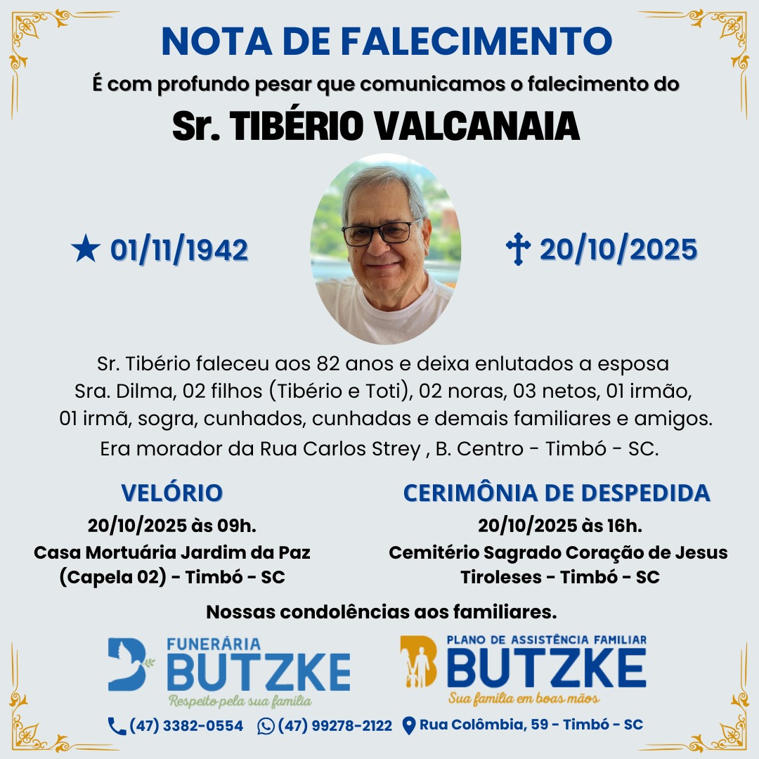 Sr. Tibério faleceu aos 82 anos e deixa enlutados a esposa Sra. Dilma, 02 filhos (Tibério e Toti), 02 noras, 03 netos, 01 irmão, 01 irmã, sogra, cunhados, cunhadas e demais familiares e amigos. Era morador da Rua Carlos Strey, B. Centro – Timbó – SC.