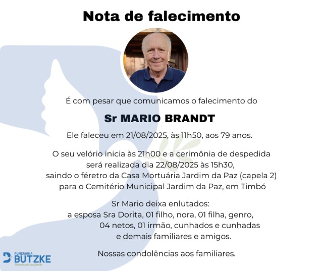 Notas de Falecimento – 21/08/2025 Agosto 21, 2025 0 Por Redação Whatsapp Share Post Share Pinterest A FAMÍLIA NOSSO SENTIMENTO E CONFORTO ——————— OUTRAS NOTAS ACESSE https://bit.ly/2YDELw3 Matérias Relacionadas: Notas de Falecimento – 12/06/2025 Notas de Falecimento – 20/06/2025 Notas de Falecimento – 24/06/2025 Notas de Falecimento – 28/06/2025 Notas de Falecimento – 10/07/2025 Notas de Falecimento – 27/07/2025 Notas de Falecimento – 01/08/2025 Notas de Falecimento – 10/08/2025 Notas de Falecimento – 15/08/2025 Notas de Falecimento – 16/08/2025 Blumenau terá programação especial para celebrar o Dia do Soldado Câmara de Timbó discute delimitação de bairros em Audiência Pública