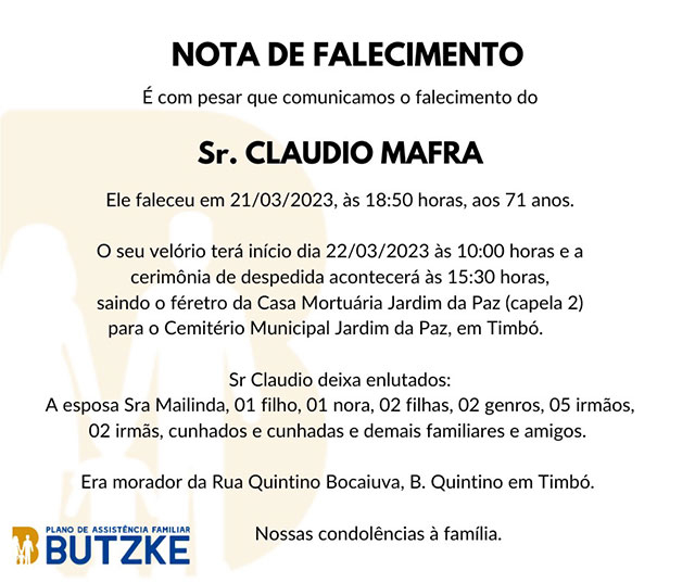 Notas de Falecimento – 22/03/2023 Março 22, 2023 0 Por Redação Whatsapp Share Post Share Pinterest A FAMÍLIA NOSSO SENTIMENTO E CONFORTO——————— OUTRAS NOTAS ACESSE https://bit.ly/2YDELw3 Matérias Relacionadas:No related posts. Artista têxtil catarinense expõe projetos na maior feira de artesanato do mundo Colaborador da UNIASSELVI homenageia equipe por se sentir acolhido e respeitado