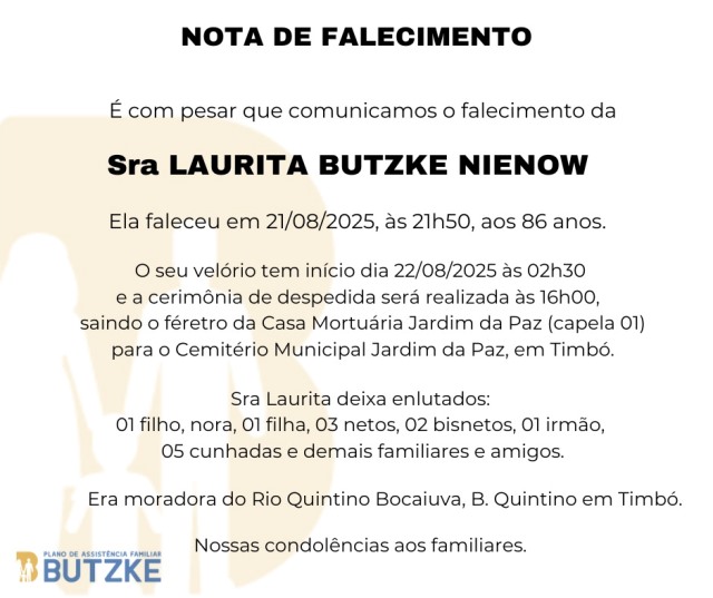 Notas de Falecimento – 22/08/2025 Agosto 22, 2025 0 Por Redação Whatsapp Share Post Share Pinterest A FAMÍLIA NOSSO SENTIMENTO E CONFORTO ——————— OUTRAS NOTAS ACESSE https://bit.ly/2YDELw3 Matérias Relacionadas: Notas de Falecimento – 12/06/2025 Notas de Falecimento – 20/06/2025 Notas de Falecimento – 24/06/2025 Notas de Falecimento – 28/06/2025 Notas de Falecimento – 10/07/2025 Notas de Falecimento – 27/07/2025 Notas de Falecimento – 01/08/2025 Notas de Falecimento – 10/08/2025 Notas de Falecimento – 15/08/2025 Notas de Falecimento – 16/08/2025 Alesc aprova Dia da Conscientização sobre a Castração Animal Coluna Escoteira – por Rogerio Gessner 22/08/2025