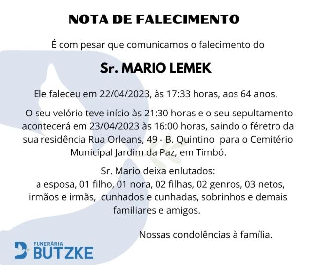 Notas de Falecimento – 23/04/2023 Abril 23, 2023 0 Por Redação Whatsapp Share Post Share Pinterest A FAMÍLIA NOSSO SENTIMENTO E CONFORTO——————— OUTRAS NOTAS ACESSE https://bit.ly/2YDELw3 Matérias Relacionadas:No related posts. Timbó – Liberado acesso de veículos na Estrada Geral da Mulde Rodeio é ouro em Transparência